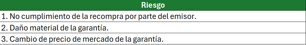 Mediante esta operación el propietario de un inventario representado en un Certificado de Depósito de Mercancías (CDM), expedido por un Almacén General de Deposito AGD, obtiene financiación al transferir el derecho sobre la custodia del título a un inversionista, a cambio del pago de una suma de dinero y con el compromiso de recomprarlo en un plazo y tasa determinada